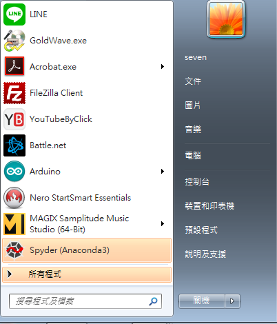 安裝完成後,可以在應用程式功能表上找到它 spyder (Anaconda3)。